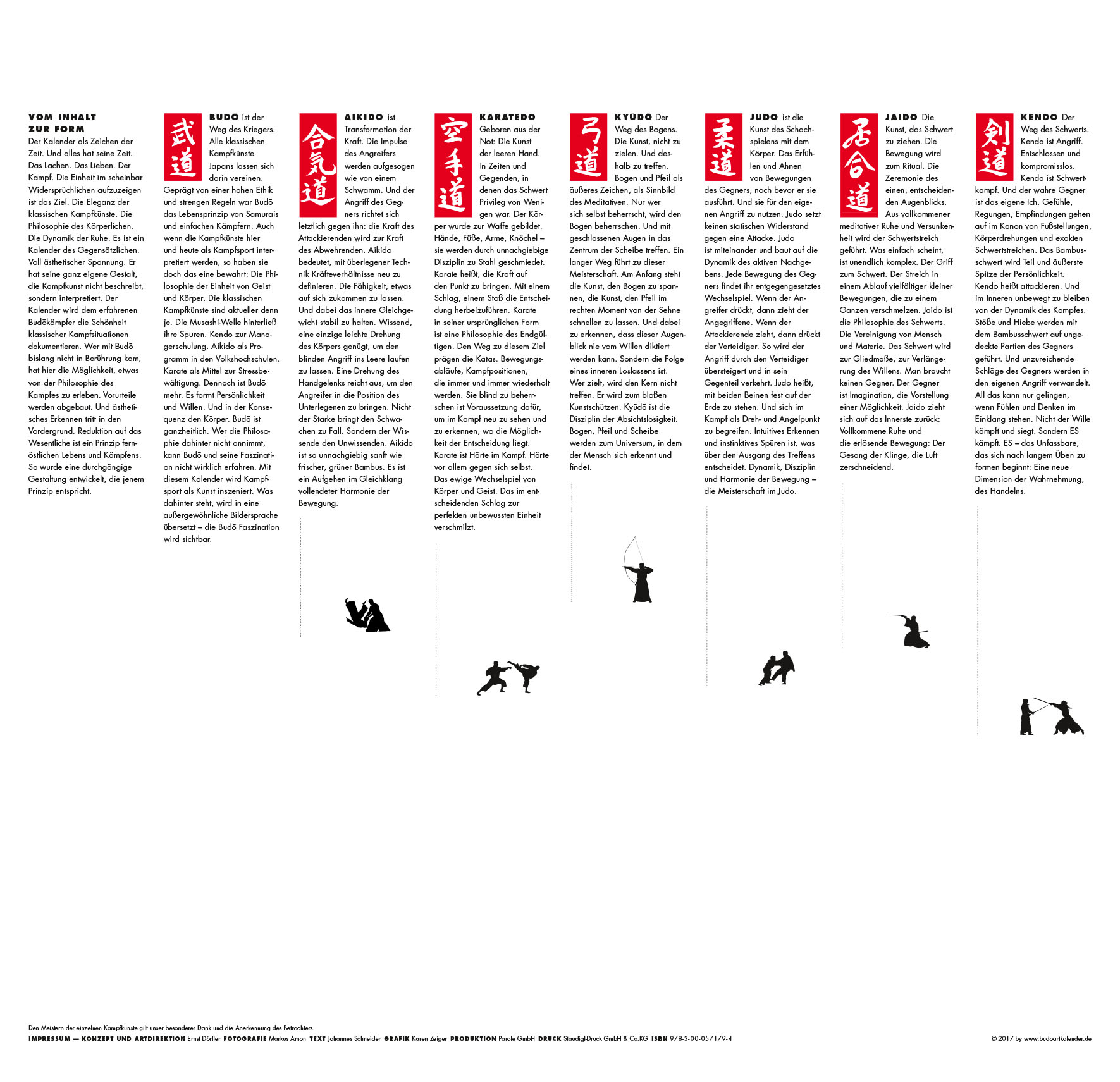 In der aufwendig gestalteten Photokunst wird sichtbar, dass sich der renommierte Fotograf Markus Amon mit den verschiedenen Budosportarten intensiv beschäftigt hat, um genau den richtigen Augenblick im Bewegungsablauf in klassischer Schwarzweißtechnik präzise festhalten zu können. Alle Abgebildeten gehören zu den Spitzenkräften der jeweiligen Budosportart.